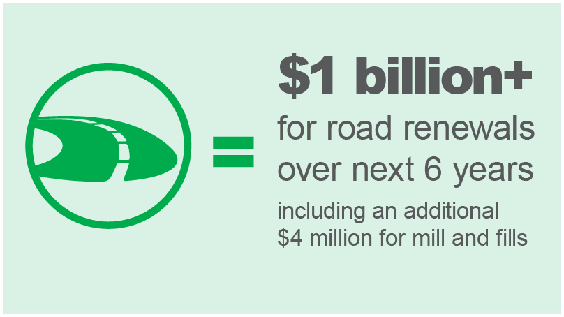 - Over $1 billion for road renewals over next 6 years including an additional $4 million for mill and fills