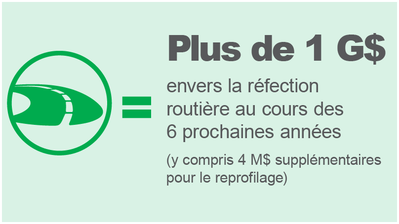 - Plus de 1 milliard de dollars envers la réfection routière au cours des 6 prochaines années (y compris 4 millions de dollars supplémentaires pour le reprofilage)