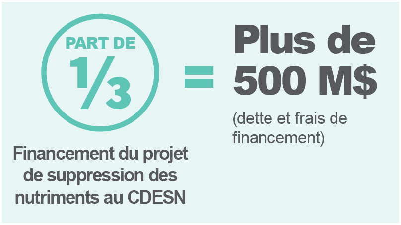 - Part de 1/3 du financement associé au projet de suppression des nutriments au CDESN – 500 millions de dollars, plus dette et frais de financement