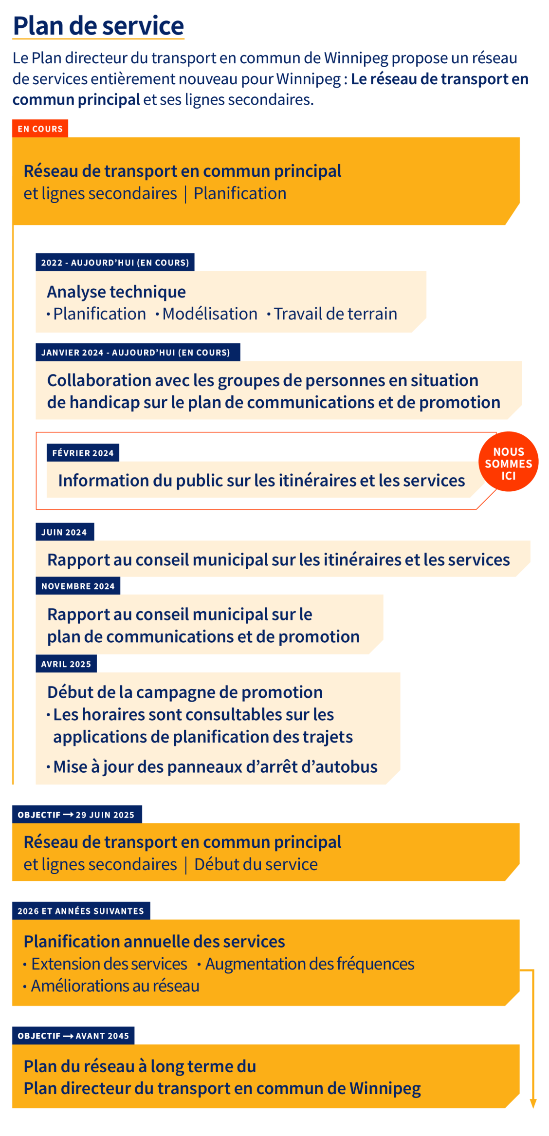 - Le réseau proposé et notre plan de mise en œuvre seront présentés au conseil municipal de Winnipeg à la mi-2024.