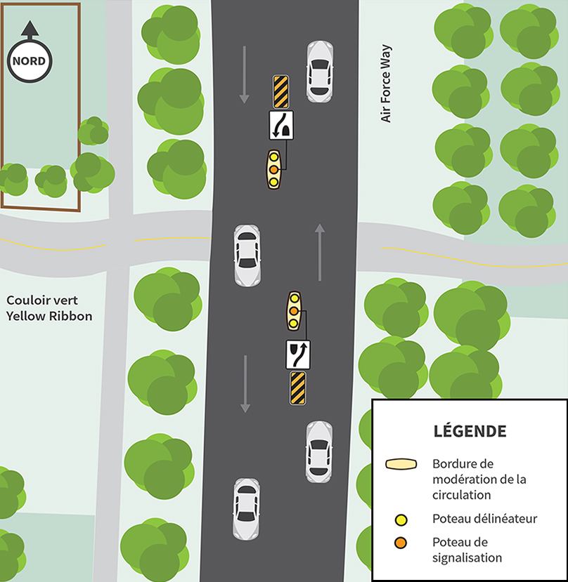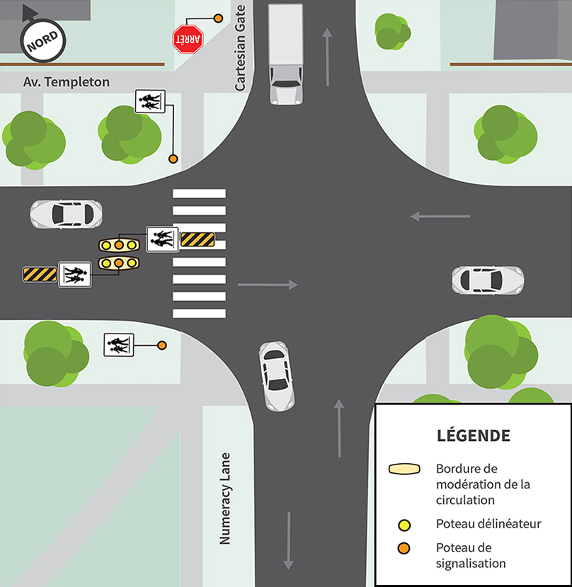 Nous installerons deux bordures de modération le long de la ligne médiane au passage pour écoliers sur l’avenue Templeton, au niveau de Numeracy Lane.