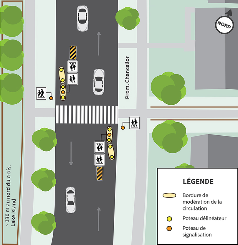 Nous installerons deux avancées de trottoir : une de chaque côté du passage pour écoliers, sur la promenade Chancellor, près du croissant Lake Island. Elles créeront une courbe sur la route, appelée chicane.
