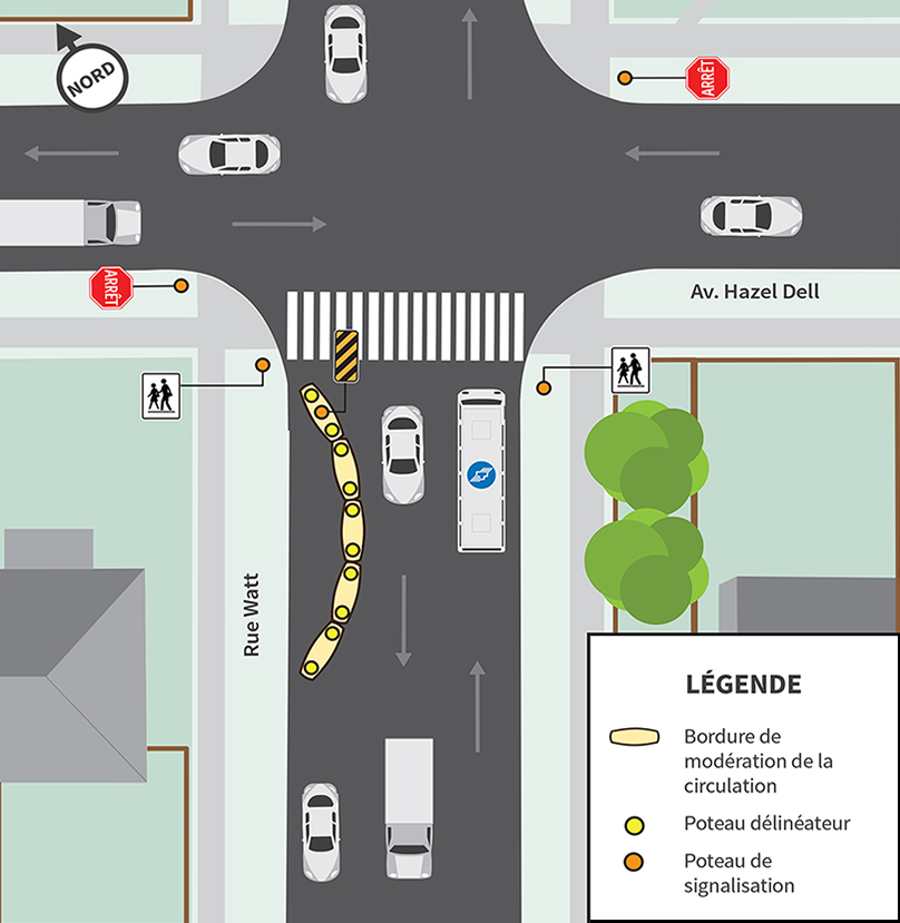 Nous installerons des avancées de trottoir du côté ouest de la rue Watt, au sud du passage pour écoliers, au niveau de l’avenue Hazel Dell.