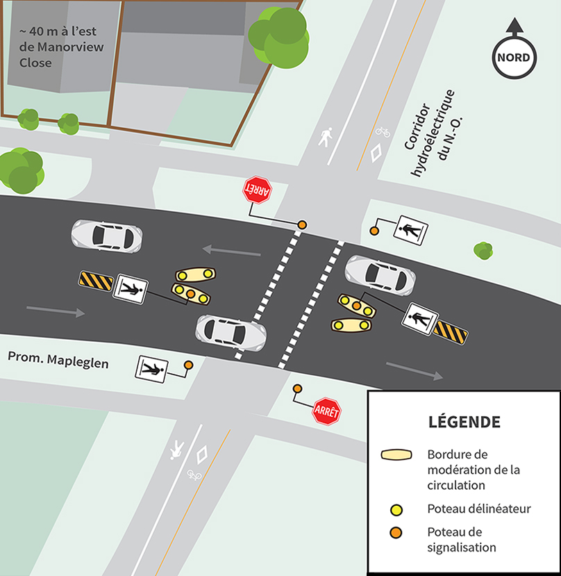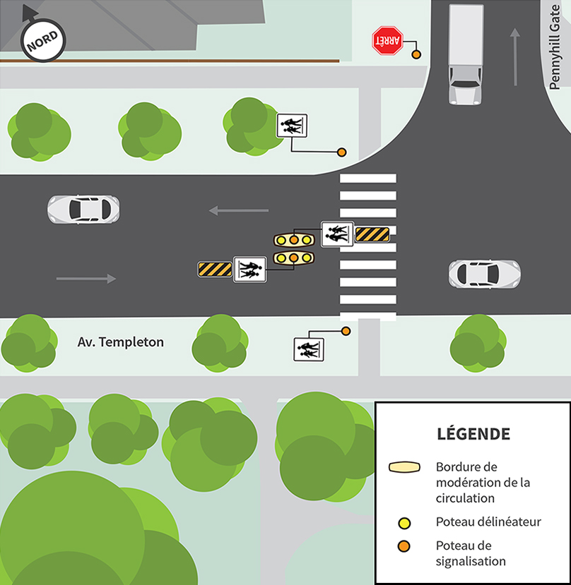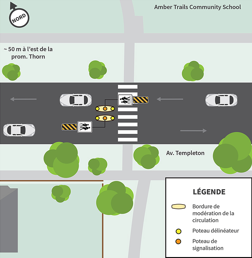 Nous installerons deux bordures de modération le long de la ligne médiane au passage pour écoliers de l’avenue Templeton, près de la promenade Thorn pour :