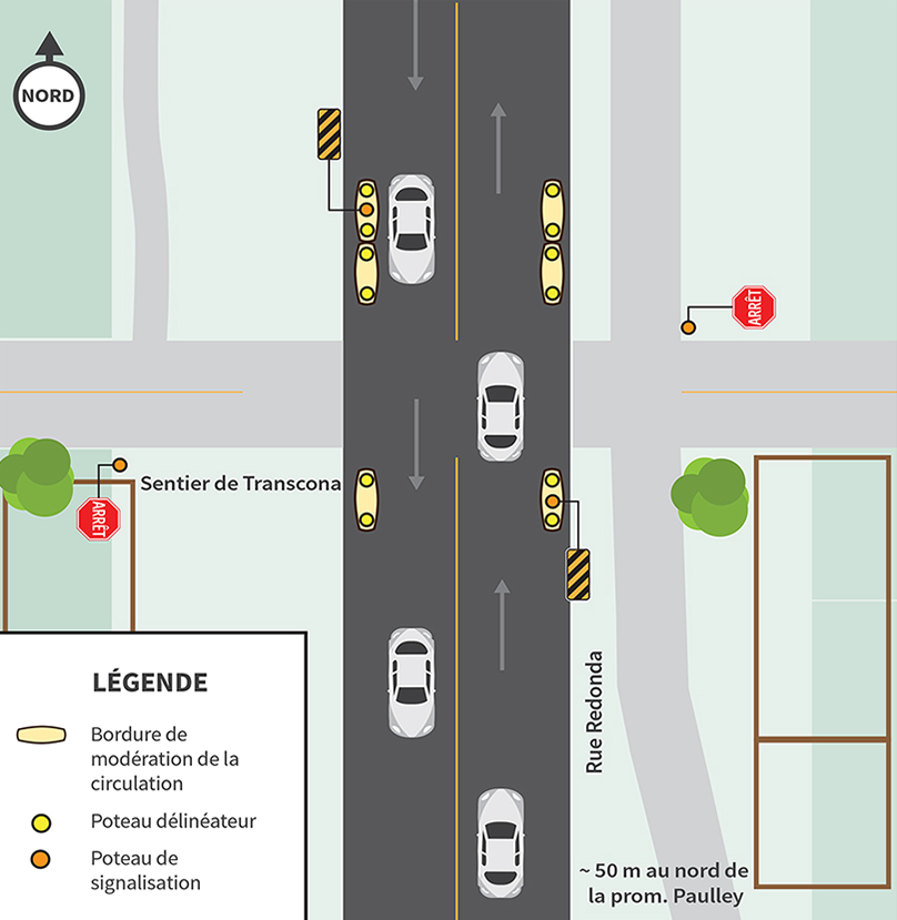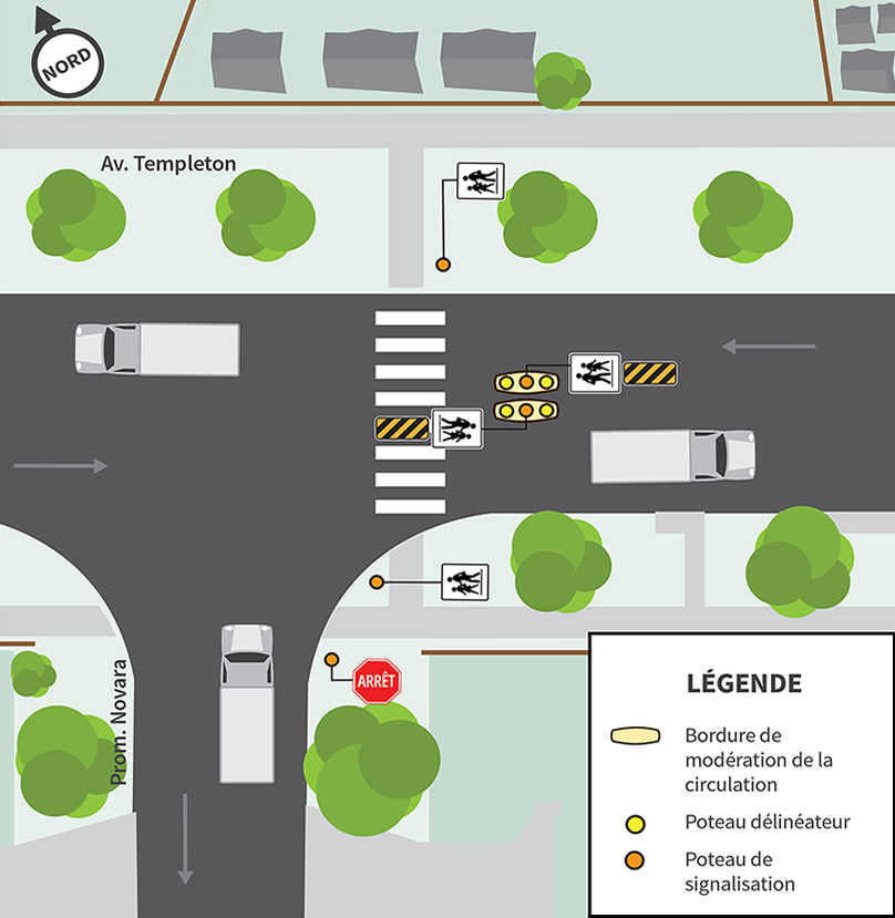 Nous installerons deux bordures de modération de circulation le long de la ligne médiane au passage piéton situé à l’intersection de l’avenue Templeton et de la promenade Novara.