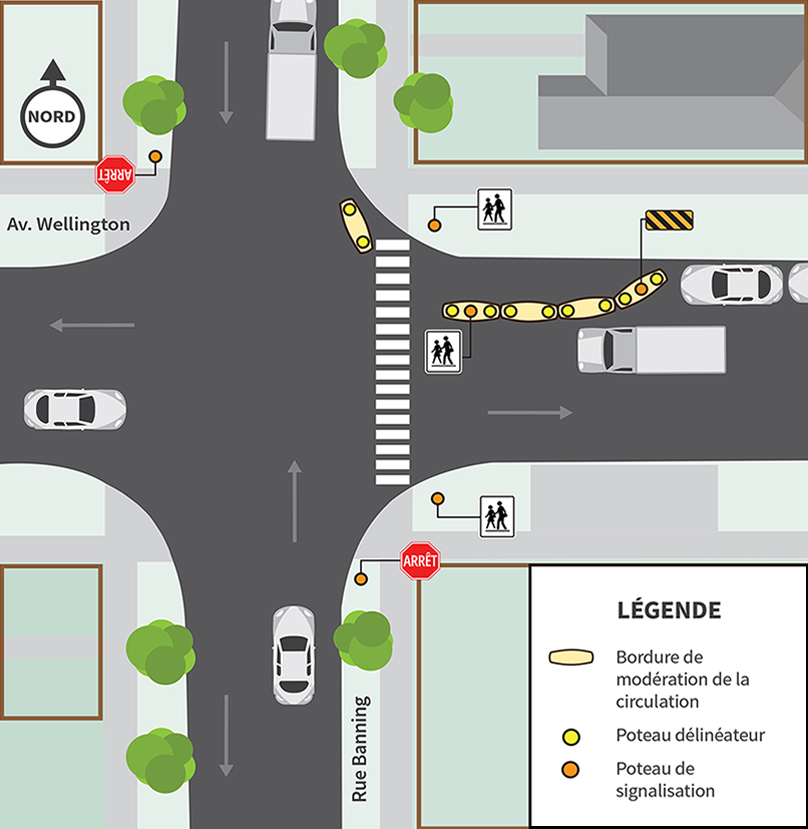 - Nous aménagerons une nouvelle zone d’arrêt interdit et supprimerons deux places de stationnement du côté nord de l’avenue Wellington, à l’est de la rue Banning.