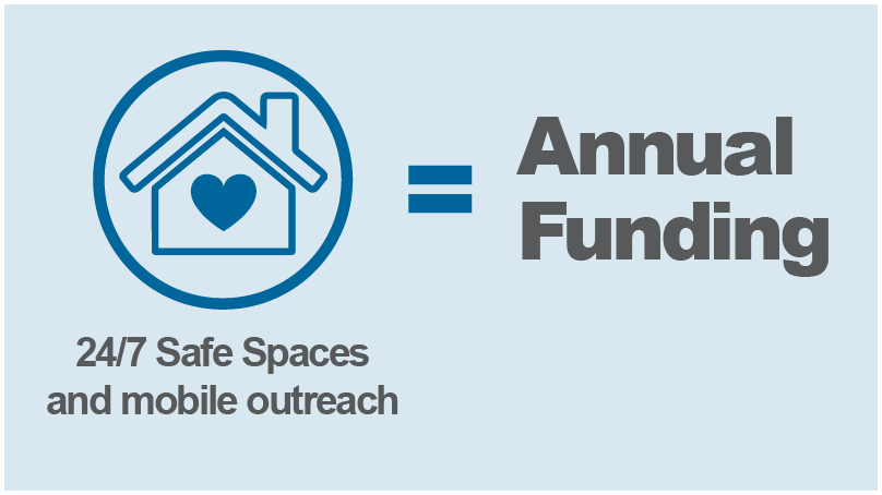 - Annual funding for 24/7 Safe Spaces and mobile outreach