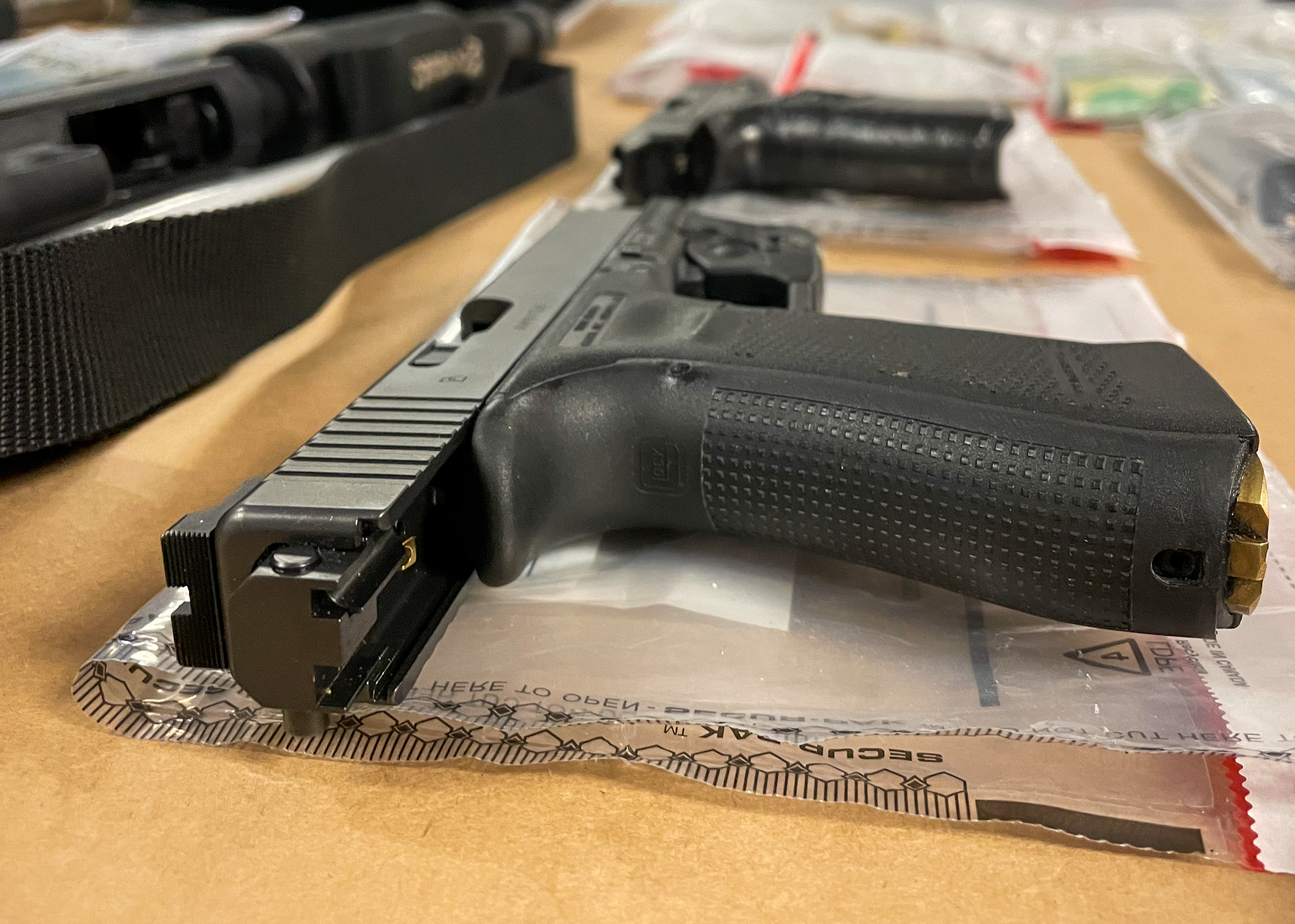 Cocaine, methamphetamine, cutting agents (substrates used in trafficking), and four firearms were seized. Included was a 3-D printed handgun and a handgun modified for automatic firing capacity.
