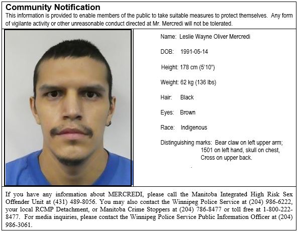 If you have information about Mr. MERCREDI, please call the Manitoba Integrated High Risk Sex Offender Unit at (431) 489-8056. You may also contact the Winnipeg Police Service at (204) 986-6222, your local RCMP Detachment, or Manitoba Crime Stoppers at (204) 786-8477 or toll free at 1-800-222-8477. For media inquiries, please contact the Winnipeg Police Service Public Information Officer at (204) 986-3061.