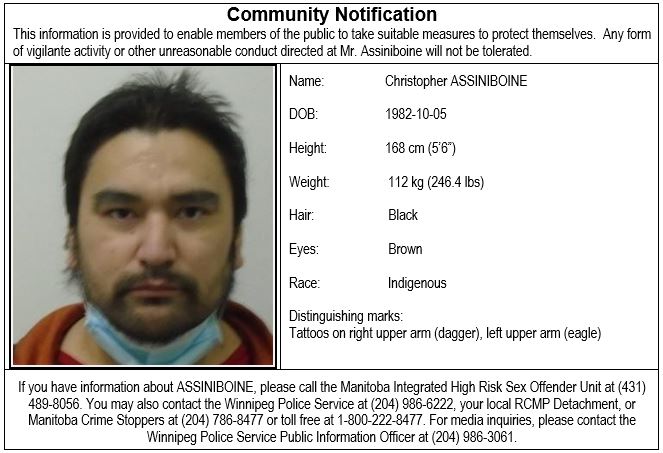 This information is provided to enable members of the public to take suitable measures to protect themselves.  Any form of vigilante activity or other unreasonable conduct directed at Mr. ASSINIBOINE will not be tolerated.