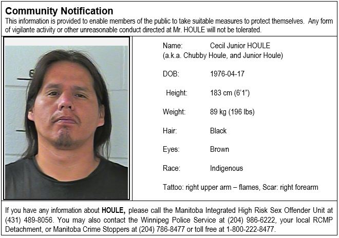 The Manitoba Integrated High Risk Sex Offender Unit (MIHRSOU) is a joint forces unit of the Winnipeg Police Service and the RCMP. MIHRSOU today provides information regarding Cecil Junior HOULE, (a.k.a. Chubby Houle and Junior Houle) 46 years of age, a convicted sex offender who is considered high risk to re-offend in a sexual manner. All persons, particularly females, are at risk of sexual violence.