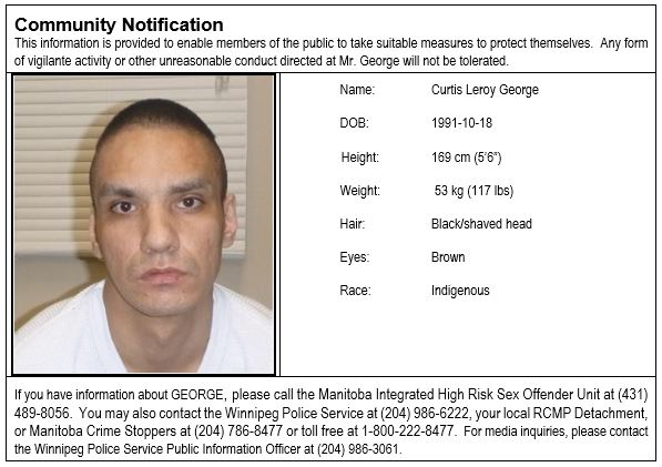 If you have any information about GEORGE, please call the Manitoba Integrated High Risk Sex Offender Unit at (431) 489-8056. You may also contact the Winnipeg Police Service at (204) 986-6222, your local RCMP Detachment, or Manitoba Crime Stoppers at (204) 786-8477 or toll free at 1-800-222-8477. For media inquiries, please contact the Winnipeg Police Service Public Information Officer at (204) 986-3061.