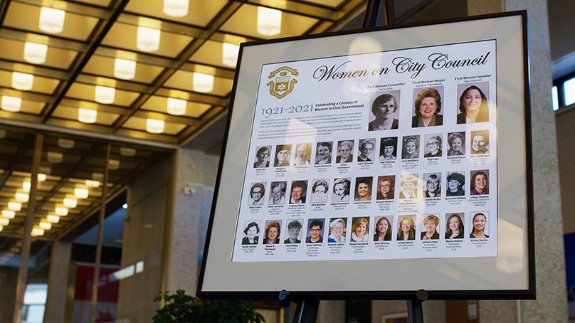 Fittingly, the building that bears Thompson’s name will be home to the new display, which features the names, photos, and dates of all women to serve on Winnipeg City Council. It was unveiled on International Women’s Day on March 8, 2021.