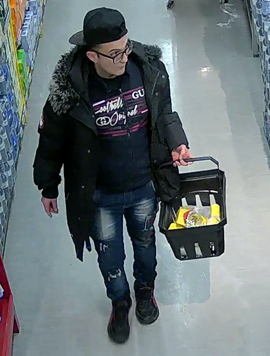 Suspect description: Male, approximately 5’8”, slim build, 20s, short dark hair wearing black framed glasses, black & white flat brim hat, black parka, blue jeans, black and red runners, black hoodie, grey backpack (photos below).