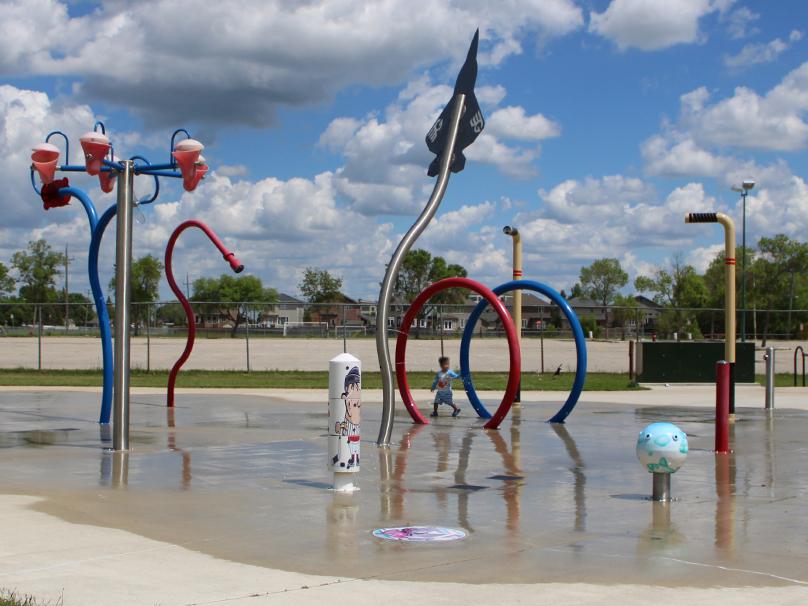 - No bicycles, skateboards, scooters, or in-line skates on the spray pad